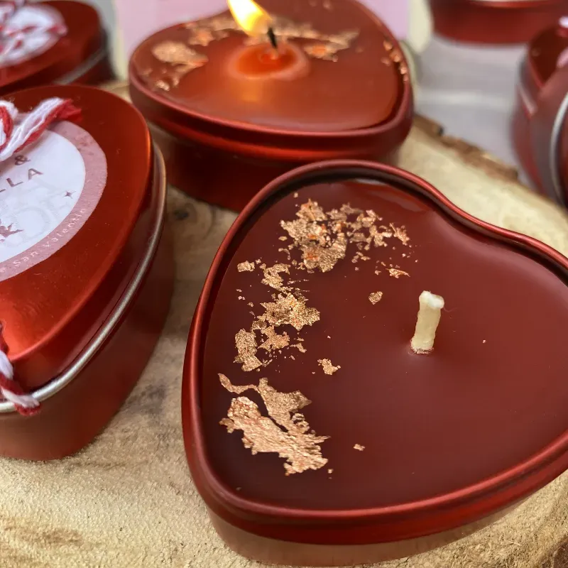 Vela con detalles dorados en lata roja en forma de corazón.