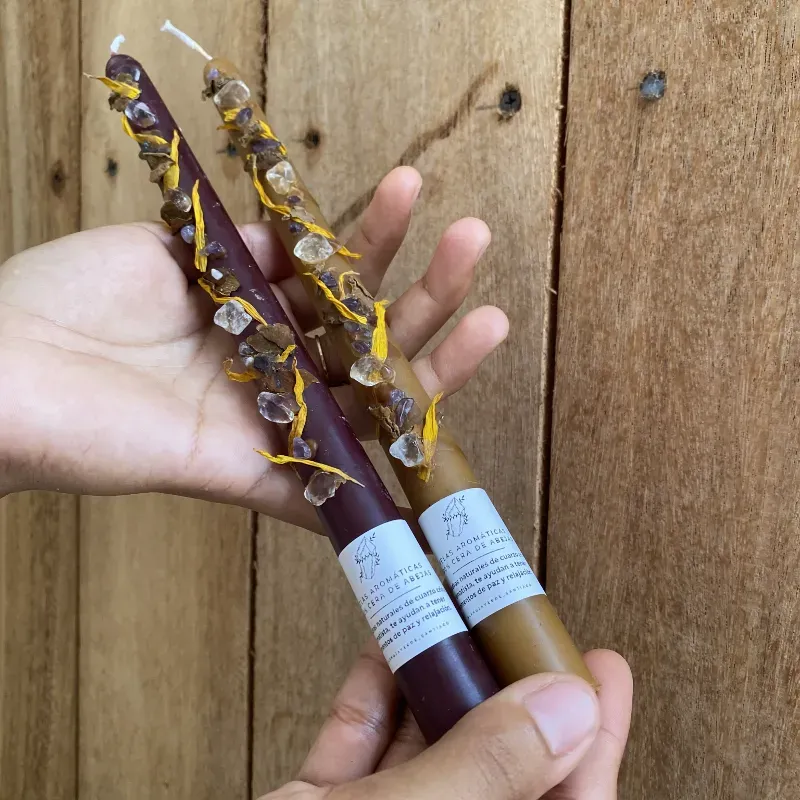 Velas largas con piedras naturales de cuarzo blanco y amatista.